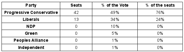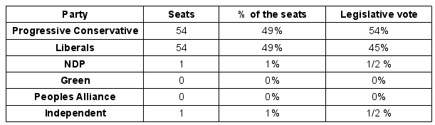 The second table shows the results using the Dual Electoral System. The top two candidates in each riding are elected. This gives both the Conservatives and Liberals the same number of seats and one seat shy of 50%. In regular session its one member one vote so no party rules the Legislature. In the riding of Woodstock the top two candidates were the PC candidate and an Independent Mr David Allen. In the riding of Tracadia-Shelia the top two candidates were the candidates for the Liberals and the NDP. In all other riding’s the top two candidates belonged to the PC and Liberals.