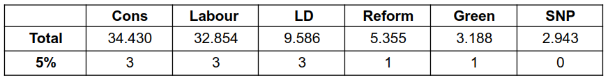 In all of the last 3 general elections the Conservatives, Labour, and the Liberal Democrats got 5% of the vote. The Green Party only got 5% in the last election. UKIP/Reform got 5% in the last election, also in 2015, but not in the 2 elections in between.