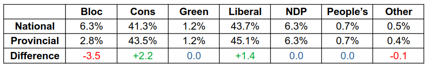 If you took the percentage each Party got in every province and added it up, divided by 10, what would you get? The average provincial popular vote and how would this compare to the national popular vote? Take a look and I was very surprised by the result.